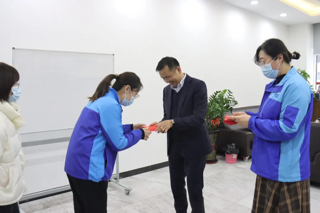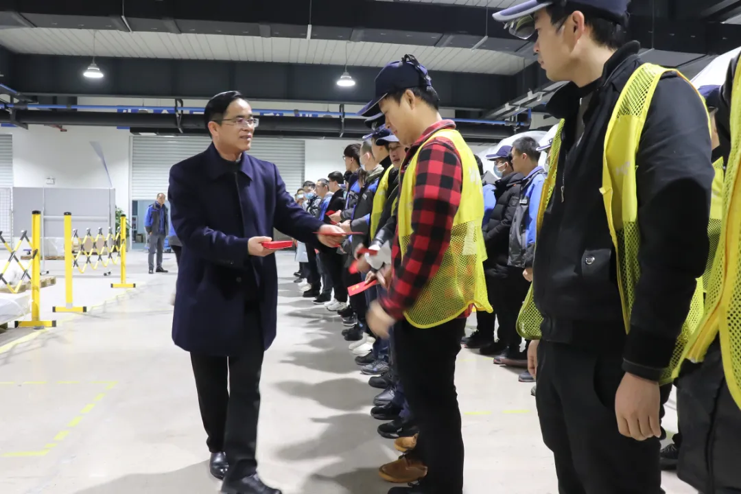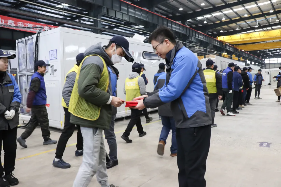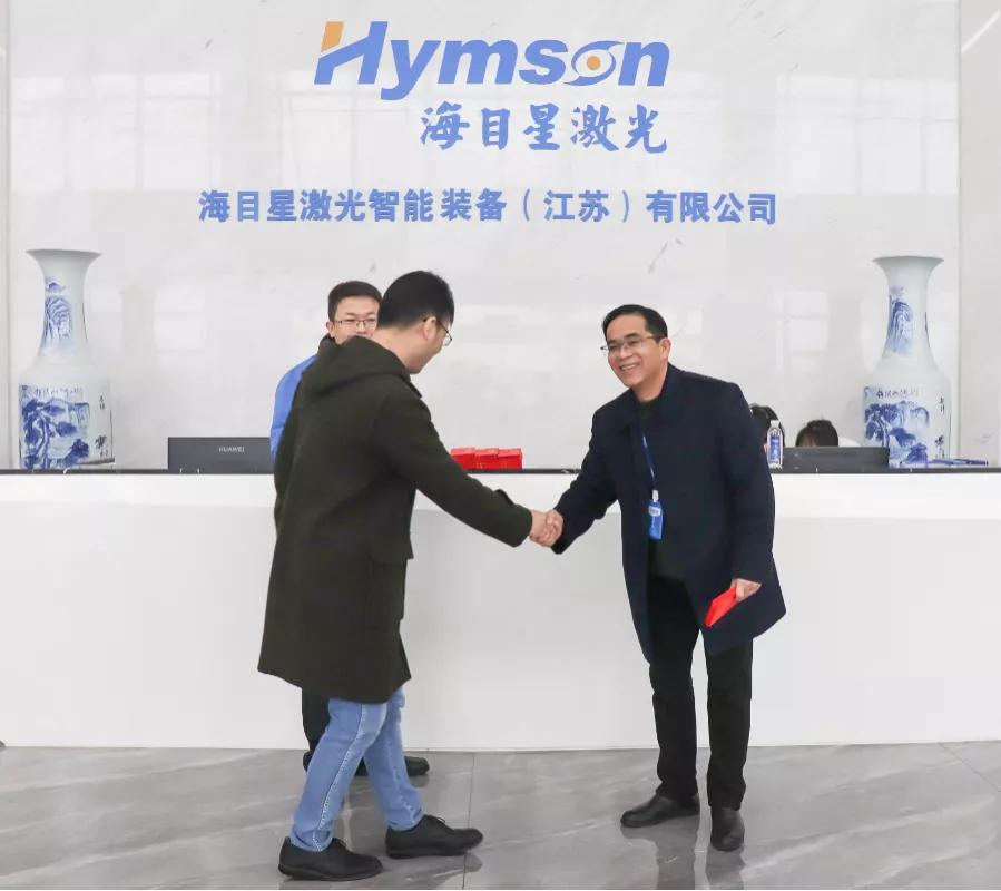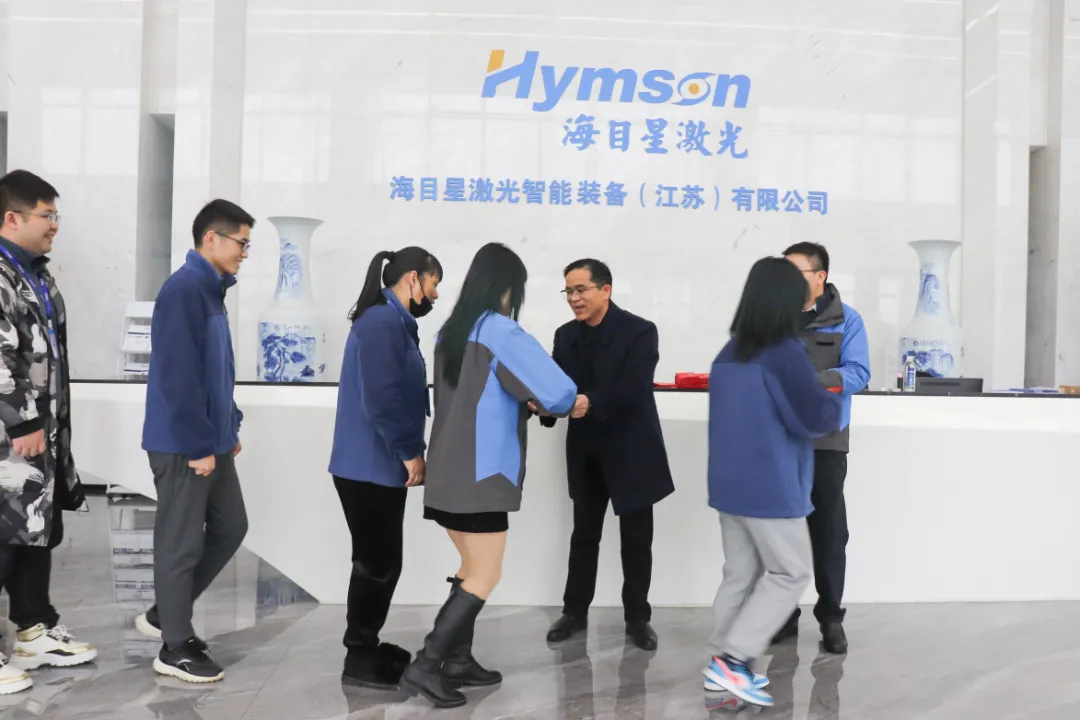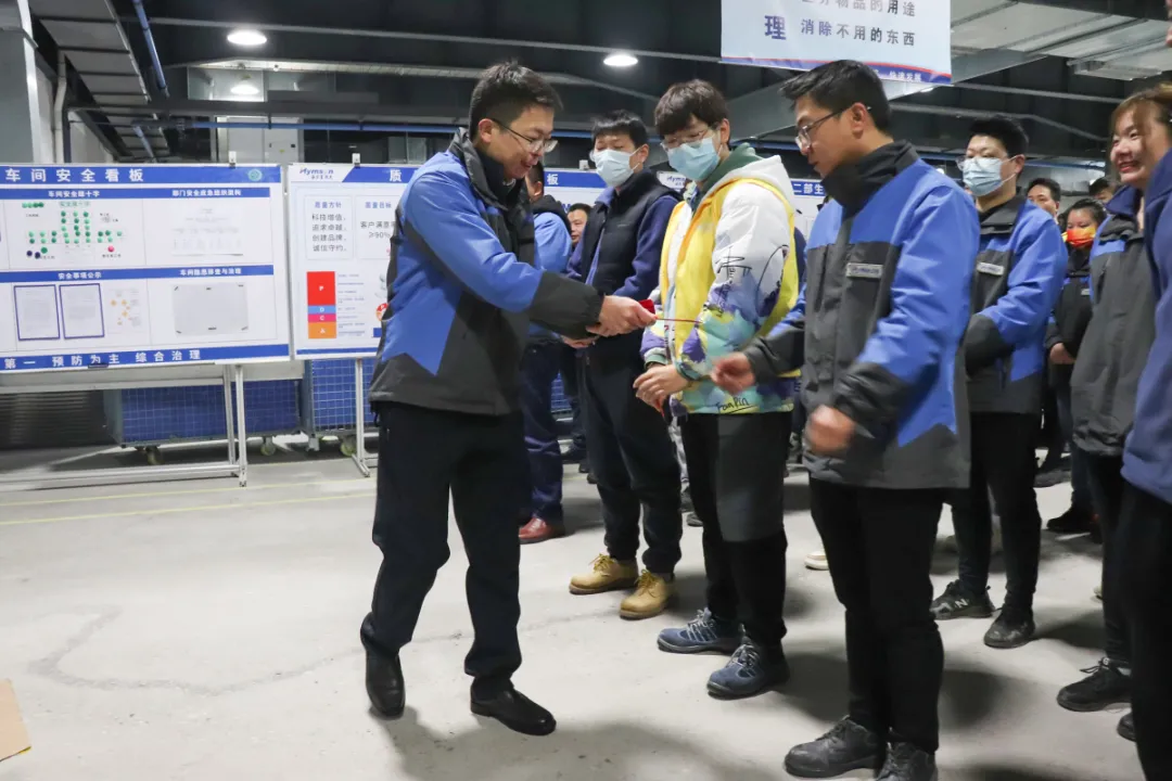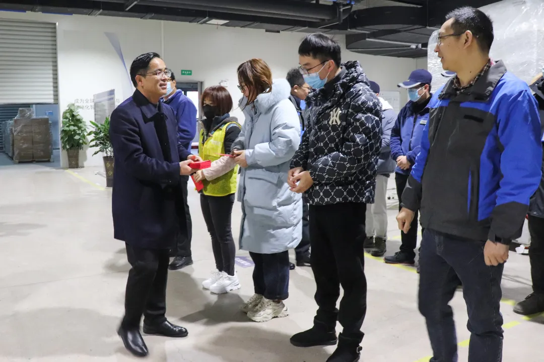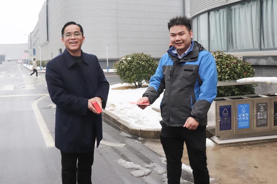 江苏海目星总经理周逸携高层领导在大厅及车间与大家互贺新春,送出暖暖的新春祝福,并鼓励大家新的一年要继续努力奋斗。