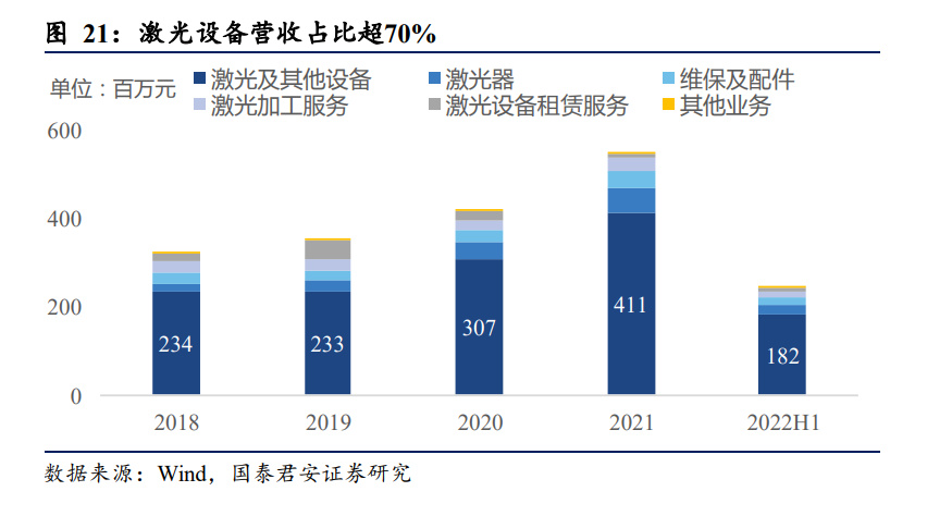 疫情影响收入确认叠加研发费用大幅上涨,公司净利润受到影响,但恢 复在即。受到疫情影响,公司下游客户订单确认进度不及预期,2022Q3 公司营收为 3.57 亿元,同比下滑 1.78%。在收入确认不及预期的情况下, 2022Q3 公司研发费用达到 5,767 万元,同比增长 39.2%,对公司盈利造 成了负面影响,2022Q3 扣非归母净利润为 2,678 万元,同比下降 41.36%; 在毛利率仅同比下降 0.98pct 的情况下,2022Q3 公司净利率同比下降 4.04pct 至 9.7%。随着疫情对下游客户确认收入的影响逐渐出清,我们 认为公司 2022 年未能确认的收入有望递延至 2023 年确认,从而改善公 司整体业绩表现。 激光设备是公司的主营业务,营收占比长期超过 70%。在公司的营收结 构中,激光设备自 2018 年起占比就保持在 70%及以上水平,成为公司 业绩增长的主要动力。