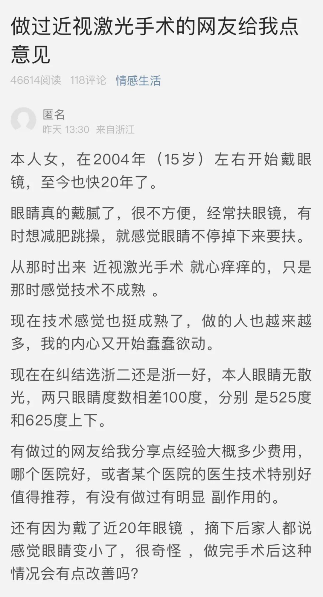 网友@瘦了的张小胖:19年浙二全飞秒25000,目前无后遗症,摘掉眼镜很爽。