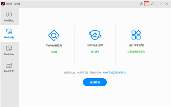 一般情况下,修复工具可一键解决“必要的系统组件未正常运行”“Flash版本不匹配”等常见运行问题,如仍未能解决,则可通过Flash Player页面右侧顶部的图标联系客服,获得专业的客服支持。