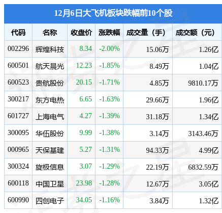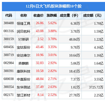 12月6日大飞机板块较上一交易日上涨0.38%,恒锋工具(300488)领涨。当日上证指数报收于3212.53,上涨0.02%。深证成指报收于11398.82,上涨0.67%。大飞机板块个股涨跌见下表:
