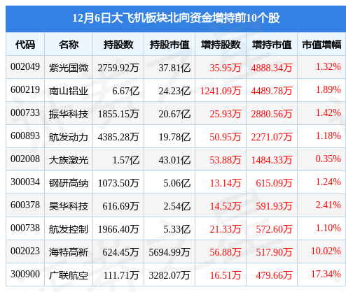 北向资金方面,当日大飞机板块北向资金持股市值为204.62亿元,增持1.43亿元。其中增持最多的是紫光国微(002049),增持了0.49亿元。减持持最多的是洪都航空(600316),减持了0.15亿元。大飞机板块北向资金持股变动明细见下表: