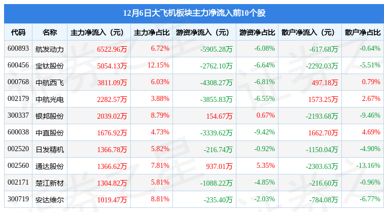 从资金流向上来看,当日大飞机板块主力资金净流出3.51亿元,游资资金净流出9082.89万元,散户资金净流入4.42亿元。大飞机板块个股资金流向见下表: