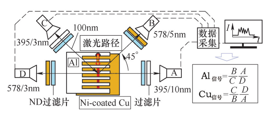 图5 Al/Cu激光焊接的测量光谱SCHALEN等使用敏感范围为340~1100nm的Thorlabs PDA100A型光电二极管和滤光片(见图6),研究了无保护气体的纯Al/Cu异种金属材料焊接中光纤激光诱导等离子体的光谱分析,结果表明,这种方法能够探测并可量化等离子体羽辉中的特定金属,394nm/396nm峰适合Al元素的分析,而578nm峰适合Cu元素的分析;与光谱仪相比,虽然分辨力有所降低,但是成本较低、采集快速;这种检测特征峰的新方法未来可应用于焊接质量矩阵的过程监控,或关于闭环过程控制的工作。该方法的研究目的在于通过光谱等离子体研究来探测Al熔进Cu侧的焊接熔深,有助于测定焊缝中是否存在熔融铜,而这是形成IMC的一个关键因素。