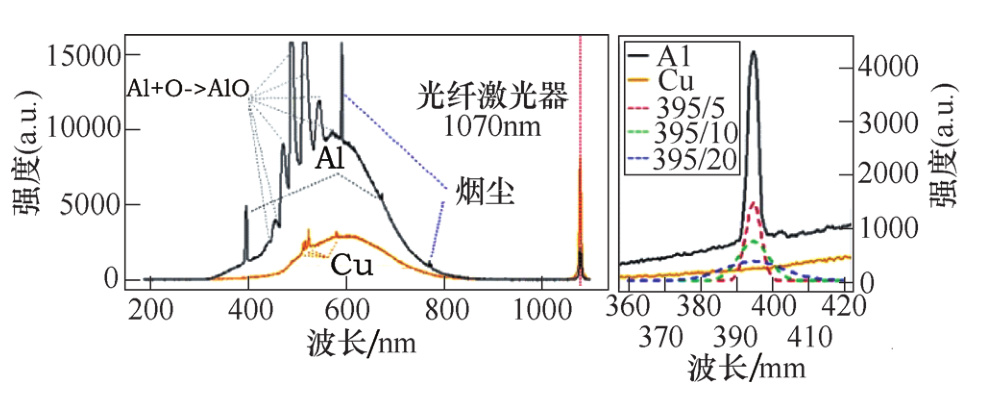 图4 裂纹结构3.2 发射光谱检测技术从激光等离子体源到X射线激光器,从惯性约束聚变到实验室天体物理,固体强激光辐照等离子体的形成是许多应用研究和基础研究领域的课题。发射光谱法(OES)适用于研究过程发射的波长,从而确定等离子体中存在的化学元素,但OES的灵敏度限制了其识别熔池最丰富元素之外的其他元素的能力。随着集成度的提高,提高OES信噪比是可行的,但这会降低时间分辨力,不利于OES作为实时监测系统的应用。CIOHBANU等利用脉冲Nd-YAG激光器和Acton Research 光谱仪(最佳光谱分辨力为0.5nm)着重研究了空气中铝和铜等离子体的发射光谱,并用Boltzmann作图法从试验观测到的CuI谱线强度提取到铜等离子体激发温度为(8210±370)K。图5为使用Oceanoptics HR2000+型光谱仪得到的纯铝和纯铜激光焊接的光谱,1070nm对应于光纤激光器的波长,铝在360~430nm之间的394.4nm/396.15nm特征双峰仅表现为395nm处单峰,在该光谱范围内未发现铜峰。440nm、454nm、467nm、487nm、514nm、544nm和566nm处的峰显示了Al与O在没有保护气体条件下反应生成了Al2O3。