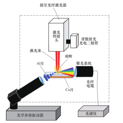 图6 测量Al/Cu特征发射的光电二极管装置3.3 激光诱导荧光检测技术高功率激光加工金属过程中合金元素之间的蒸气压差会造成非均衡的合金元素损失,在激光焊接中造成力学性能和微观组织的变化,对加工材料的质量产生负面影响。在之前的相关研究中,这类测定工作均是建立在有损的、非原位分析基础上的。激光诱导荧光检测技术(LIF)是一种更加有效的、原位的、实时的监测蒸气元素损失的非接触式光学技术(见图7),能够应用在激光焊接工艺中,对于低浓度合金元素损失检测,比过去人们依赖的发射光谱法(OES)敏感4万倍。通常情况下,Al/Cu激光焊接是以搭接的形式,激光入射到Al片上,为了限制IMC的形成,下层Cu的熔化时间成为关键因素。因此,探测激光焊接蒸气羽辉中的铜原子可以作为IMC形成的有效证据。前面提到的发射光谱检测技术(OES)的应用,缺点在于有限的灵敏度只能确定激光是否入射到Al或Cu表面。SIMONDS领导的团队是LIF应用在激光焊接领域内的活跃研究者,其利用LIF技术研究了对Al/Cu激光搭接焊焊接过程进行原位监测的可能性,结果表明,即使在焊缝熔深太浅而未形成牢固焊接接头的情况下,LIF仍具有足够的灵敏度在真实条件下探测到Al/Cu异种金属薄片激光焊接蒸气烟尘中的Cu原子信号。LIF可凭借其优异的灵敏度,成为实时的、原位过程监测的工具,同时也是研究激光焊接基础动力学的工具。