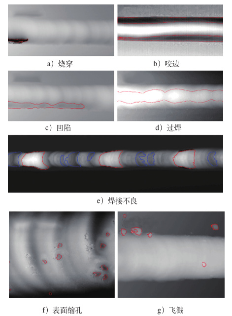 图1 良好焊缝与焊接缺陷2.传统无损检测技术的局限性国内外焊接生产型企业对于焊缝质量的无损检测一般都采用超声波(UT)、渗透(PT)、磁粉(MT)、X射线(XT)等传统检测手段,少数单位拥有计算机断层扫描(CT)检测设备。目前,汽车动力电池行业相关组织单位尚未颁布统一的Al/Cu激光搭接焊接缺陷接受水平及其检测方法的标准规范,汽车电池模组的制造商采用企业级检测技术方法与标准规范,多为金相检测、拉伸试验等常规破坏性理化检测技术。相对而言,传统无损检测方法在大批量生产的汽车电池模组件Al/Cu异种金属搭接激光焊缝检测中的应用具有明显的局限性,主要原因在于电池模组整体尺寸较大,而激光焊缝宽度特别狭窄。例如,UT需要在工件涂抹耦合剂,而且精度难以保证微米级尺寸焊接缺陷的检测需求;PT需要至少喷渗透剂和显像剂,还需要清洗等后处理工序;XT对人体有辐射,其穿透性不适用于电池模组的厚度;MT只适用于铁磁性焊接材料的检测,不适用于无磁性的Al/Cu工件。当然,传统的焊接缺陷无损检测方法也有一定的应用价值,例如,当焊缝试件从模组上取下后,XT和CT可以用于表征其焊接缺陷属性。目视检测(VT)适用于检测目视可见的表面焊接缺陷,缺点是在量产阶段人工检测的工作效率极低,漏检率较高。3.先进无损检测技术的进展激光焊缝缺陷的先进无损检测技术有超声波红外热像技术、超声波C扫描成像技术、空气耦合超声波检测技术、全聚焦成像技术、同轴图像传感技术及磁光成像检测技术等。目前,这些先进无损检测技术方法在电池制造工业中应用非常有限。为实现汽车动力电池模组件Al/Cu激光焊缝的快速、批量无损检测技术的应用,尚需融合非传统的先进检测技术,开发探索激光焊缝缺陷人工智能可视化检测技术。实现焊缝缺陷检测技术可视化、自动化是未来的发展趋势,人工智能技术是焊缝缺陷检测的关键技术。开发适用于汽车动力电池生产线上Al/Cu异种金属激光搭接焊缝的人工智能无损检测技术,是有待深入探索的工业技术挑战课题。3.1 机器视觉检测技术随着机器视觉理论的发展,机器视觉检测技术逐渐应用于焊接生产的实时监控与质量检测,通过摄像机获取被测图像,集中用于对焊点的识别检测。金属片的激光焊接区域,可视为无数点焊形成的焊缝,使得机器视觉系统在对焊缝实时监控中具备应用可行性。由于软包单体电池自身的特点,焊接工装定位尤为困难,将机器视觉系统用于动力电池模块的组装及焊接,有助于实现电池组装的高精度定位以及电池激光焊接的实时追踪。徐劼深入讨论了如何使用iRVision机器视觉系统进行单体电池极耳高精度定位以及Precitec视觉系统对激光焊缝的实时精准追踪,设备制程能力评判标准CPK结果显示,视觉系统参与定位引导的制造设备的制程能力远高于不使用视觉系统的制造设备,解决了动力电池模组制造过程中激光焊接合格率低的问题。龚凯学等基于机器视觉对快充电池表面金属片激光焊接区域进行识别与检测的研究,检测系统构成时选择了合适的采集摄像机及光源照明方案,预处理阶段进行图像的灰度处理、模糊度量及复原,焊接区域的识别中设计了阈值分割与边缘检测相结合的自适应算法,通过特征提取实现对偏焊、过焊、虚焊等焊接缺陷的识别与检测。YAN等构建了一种能够同时对铝合金焊缝表面进行三维深度和二维灰度成像的复合视觉系统,在多角度灰度二维图像中提出了裂纹(见图2)、表面黑化等缺陷的提取算法,在三维深度图像中研究了凹陷、咬边、烧穿、过度强化、表面气孔、飞溅及成形不良等缺陷(见图3)的提取算法。