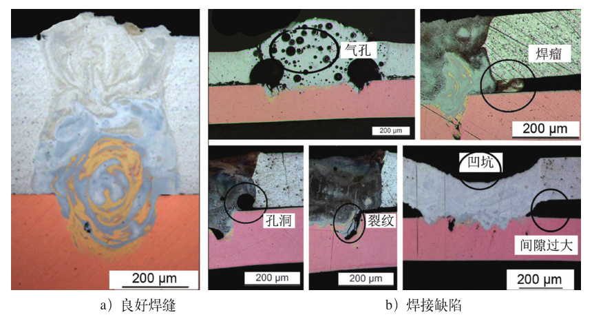Al/Cu异种金属材料激光搭接焊接工艺已成为新能源汽车锂离子电池制造的关键技术,且要求这些焊接接头具备优良的力学性能和导电性能。例如,比亚迪电动汽车电池工厂安装了碟片式激光器,激光搭接焊接工艺在厚度≤2mm的铜、铝薄板部件上实现,要求焊缝微细、热扩散低、内应力低,并将变形降至最低。然而,Al/Cu异种金属材料的激光焊接通常较为困难,原因在于不同金属元素之间光学性能和热物理性能的差异性与不兼容性,Al/Cu大量混合会形成脆性的、高电阻的金属间化合物相(IMC)。在实际生产中,汽车电池模组制造商倾向于选择通过控制Al/Cu熔化时间来抑制IMC相生成量的解决方案,这样就会使工艺参数窗口变得非常狭窄。Al/Cu激光焊接固有的不稳定性使得生产中很难保证焊接性能的重复性与再现性,不可避免地形成未焊透、未熔合、烧穿、咬边、焊瘤、凹坑、间隙过大、气孔及裂纹等焊接缺陷。图1显示了Al/Cu异种金属激光焊接的良好焊缝与常见的典型焊接缺陷。本文重点阐述国内外新能源汽车动力电池制造行业中模组件Al/Cu激光搭接焊接领域先进无损检测技术的应用与进展。