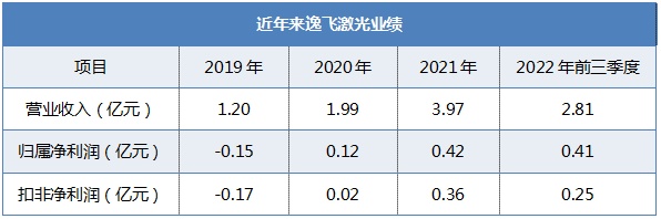 受益于新能源汽车、储能及消费电子市场的快速发展,下游客户动力电池、储能电池及消费电池制造企业不断扩产,逸飞激光业绩因此保持快速增长态势。2022年前三季度,实现营业收入2.81亿元,归属净利润0.41亿元,扣非净利润0.25亿元,同比增长均在50%以上,预计2022年度业绩继续预增,全年可实现营业收入5.3亿-5.8亿元,归属净利润0.72亿-0.82亿元,扣非净利润0.55亿-0.65亿元。