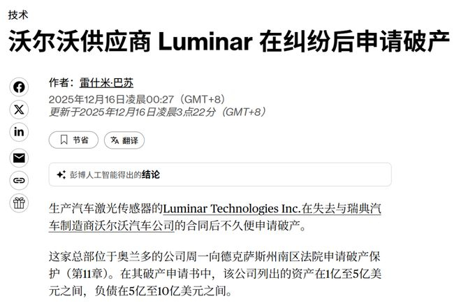 人称“ 全美最后希望 ”的 Luminar 突然申请破产。这下可好,如果再把中国的激光雷达给禁了,西大这满朝文武,可能真无兵可派,无人可用。。。